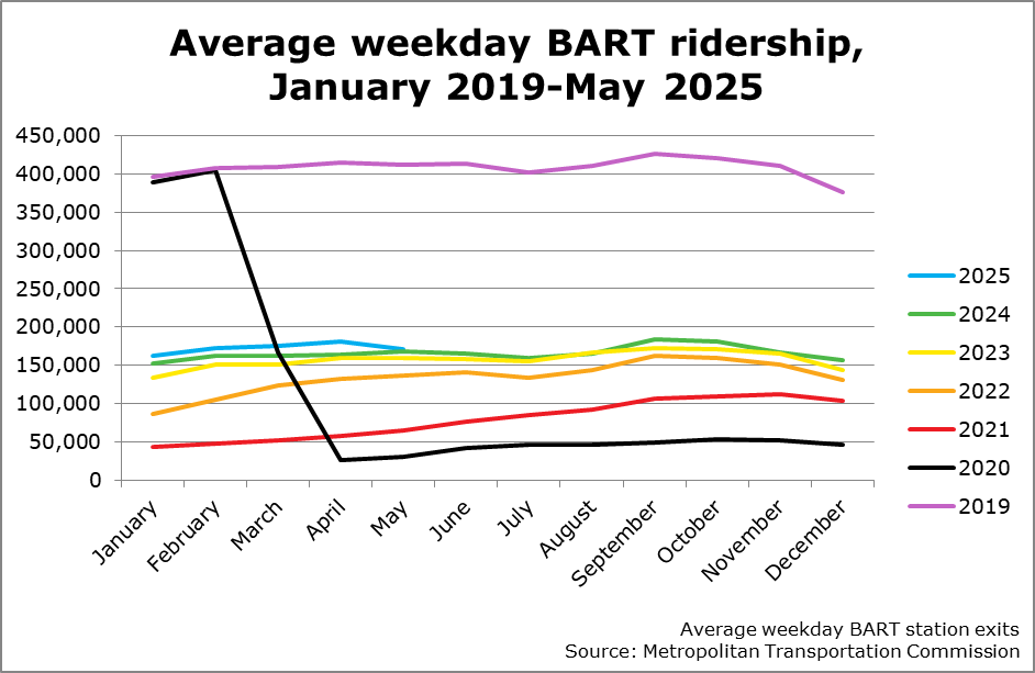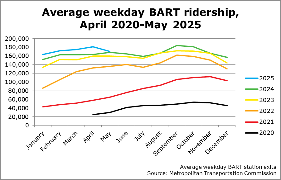 Since the end of Covid, public transit ridership in the San Francisco Bay Area has been going steadily up. I moved to San Francisco in late 2021, near the nadir of subway ridership, and even during rush hour it was like a ghost town. In the two years I was gone, I came back every four or five months. Every time, I noticed that the subway — called Bay Area Metropolitan Transit, BART for short — felt a little bit more crowded, a little bit more city-ish.